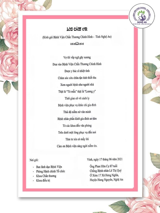Giữa lúc căng thẳng ấy, tinh thần của nhân viên y tế chúng tôi đã được xoa dịu bởi những vần thơ tri ân đầy chân thành được cụ Phan Hữu Cự - người nhà bệnh nhân Lê Thị Quý gửi tới tập thể BVCTCHNA.