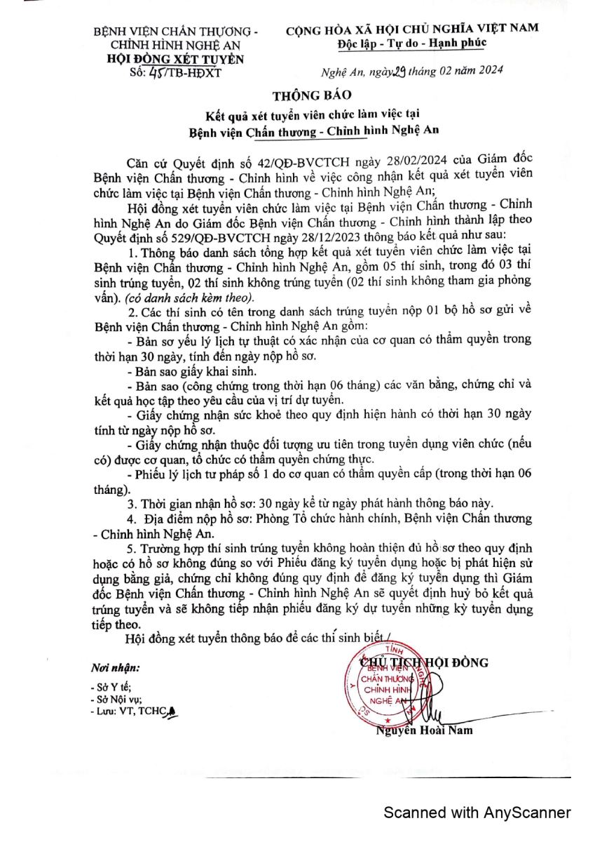 Bệnh viện Chấn thương Chỉnh hình Nghệ An xin thông báo kết quả xét tuyển viên chức như sau: