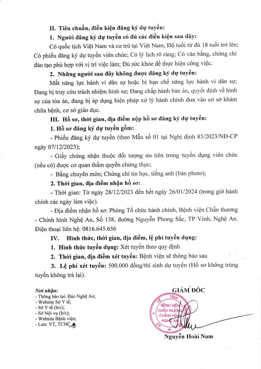 Thông báo kết quả xét tuyển viên chức làm việc tại Bệnh viện Chấn thương - Chỉnh hình Nghệ An